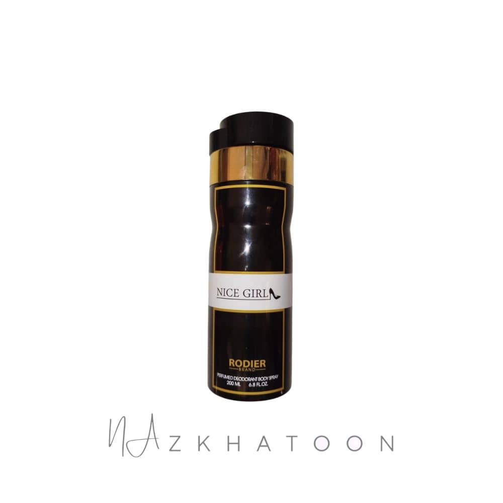 اسپری خوشبوکننده بدن زنانه رودیر رایحه نایس گرل (Rodier Nice Girl) با الهام از عطر معروف Good Girl، ترکیبی از لطافت و جسارت را در یک رایحه خاص و اغواگر برای بانوان ایجاد کرده است. این اسپری با طراحی شیک و طلایی‌رنگ، با حجم ۲۰۰ میلی‌لیتر، انتخابی ایده‌آل برای خانم‌هایی است که رایحه‌ای متمایز و به‌یادماندنی می‌خواهند.