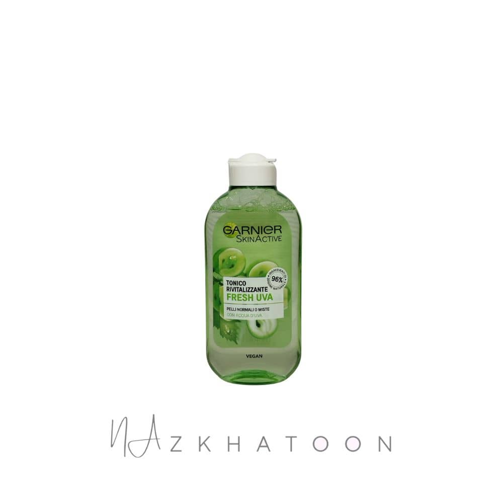 تونر گارنیه مدل Fresh UVA از سری محصولات محبوب Garnier SkinActive، با فرمولی غنی‌شده از آب انگور طبیعی و ترکیبات گیاهی، انتخابی عالی برای پوست‌های معمولی تا مختلط است. این تونر با ۹۶٪ ترکیبات طبیعی، آلودگی‌ها، ناخالصی‌ها و بقایای آرایش را بدون ایجاد خشکی پاک می‌کند و طراوتی فوری به پوست شما می‌بخشد.