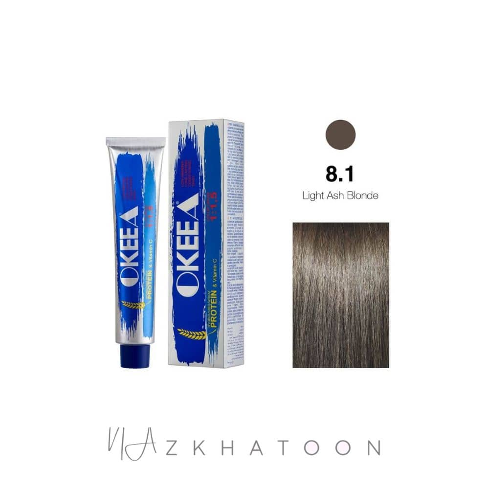 ویژگیهای رنگ موی اکیا OKEEA شماره 8/1 بلوند خاکستری روشن